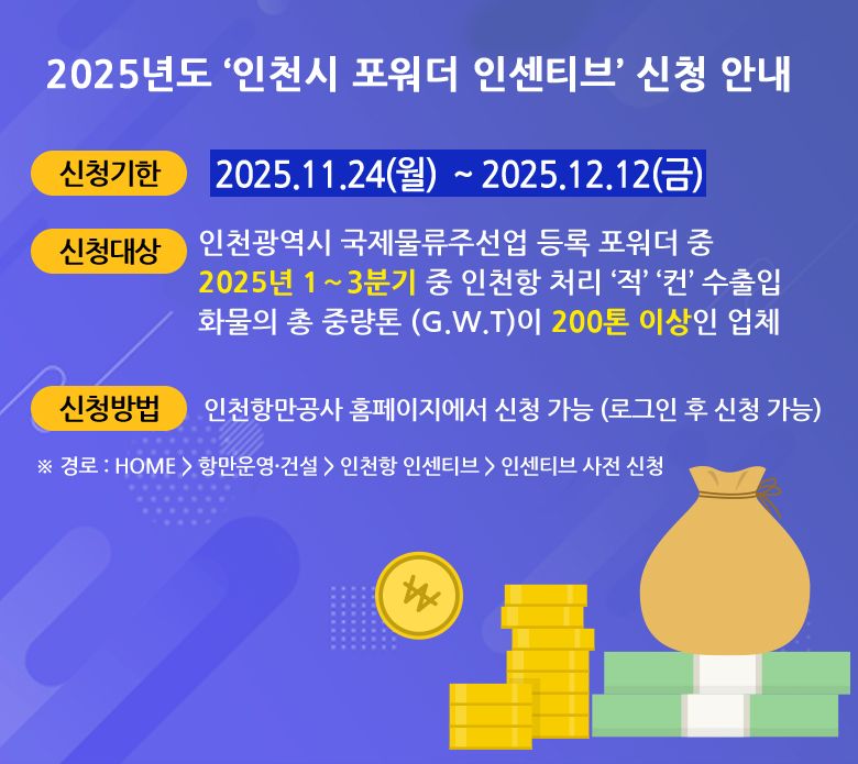 ÀÎõÇ׸¸°ø»ç(»çÀå À̰æ±Ô, IPA)´Â ÀÎõ½Ã±¤¿ª½Ã(½ÃÀå À¯Á¤º¹)¿Í ÀÎõÁö¿ª ¹°·ù¾÷°è Áö¿øÀ» ÅëÇÑ ÀÎõÇ× ¹°µ¿·® Áõ´ë¸¦ À§ÇØ ¡®2025³âµµ ÀÎõ½Ã Æ÷¿ö´õ Àμ¾Æ¼ºê¡¯ Áö¿ø±â¾÷À» ³»´Þ 12ÀϱîÁö ¸ðÁýÇÑ´Ù°í 11¿ù 23ÀÏ ¹àÇû´Ù.