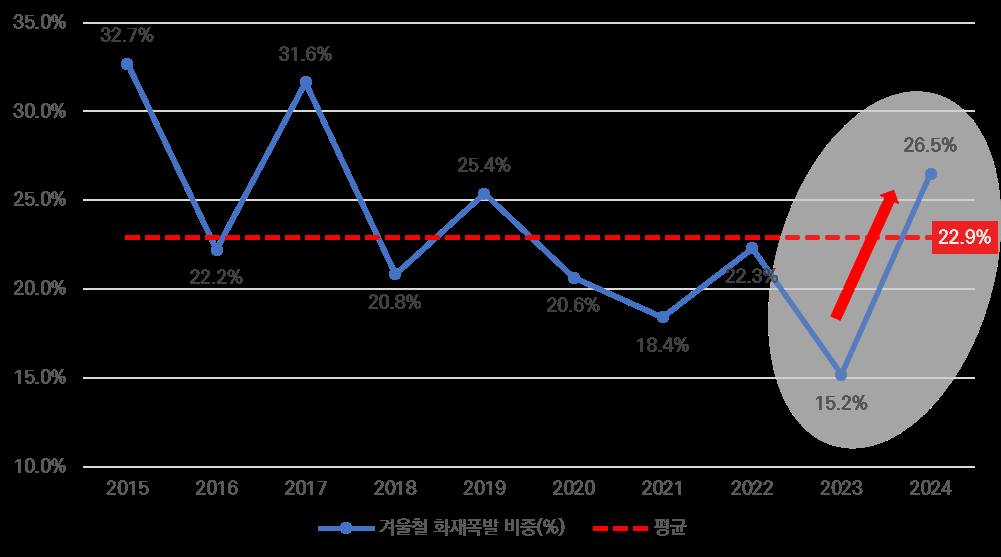 Çѱ¹Çؾ米Åë¾ÈÀü°ø´Ü(KOMSA, ÀÌ»çÀå ±èÁؼ®)ÀÌ ÇØ¾ç±³Åë¾ÈÀüÁ¤º¸½Ã½ºÅÛ(MTIS, ÇØ¾ç¼ö»êºÎ À§Å¹)À» ÅëÇØ ÃÖ±Ù 10³â(¡¯15~¡¯24³â)°£ °èÀýº° ¼±¹Ú ÈÀç¡¤Æø¹ß »ç°í ºñÁßÀ» ºÐ¼®ÇÑ °á°ú, Àüü °èÀý¿¡¼ °Ü¿ïö ¼±¹Ú ÈÀç¡¤Æø¹ß »ç°í ºñÁßÀº ²ÙÁØÈ÷ °¨¼ÒÇÏ´Ù°¡ Áö³ÇØ 26.5%·Î ¹ÝµîÇß´Ù.