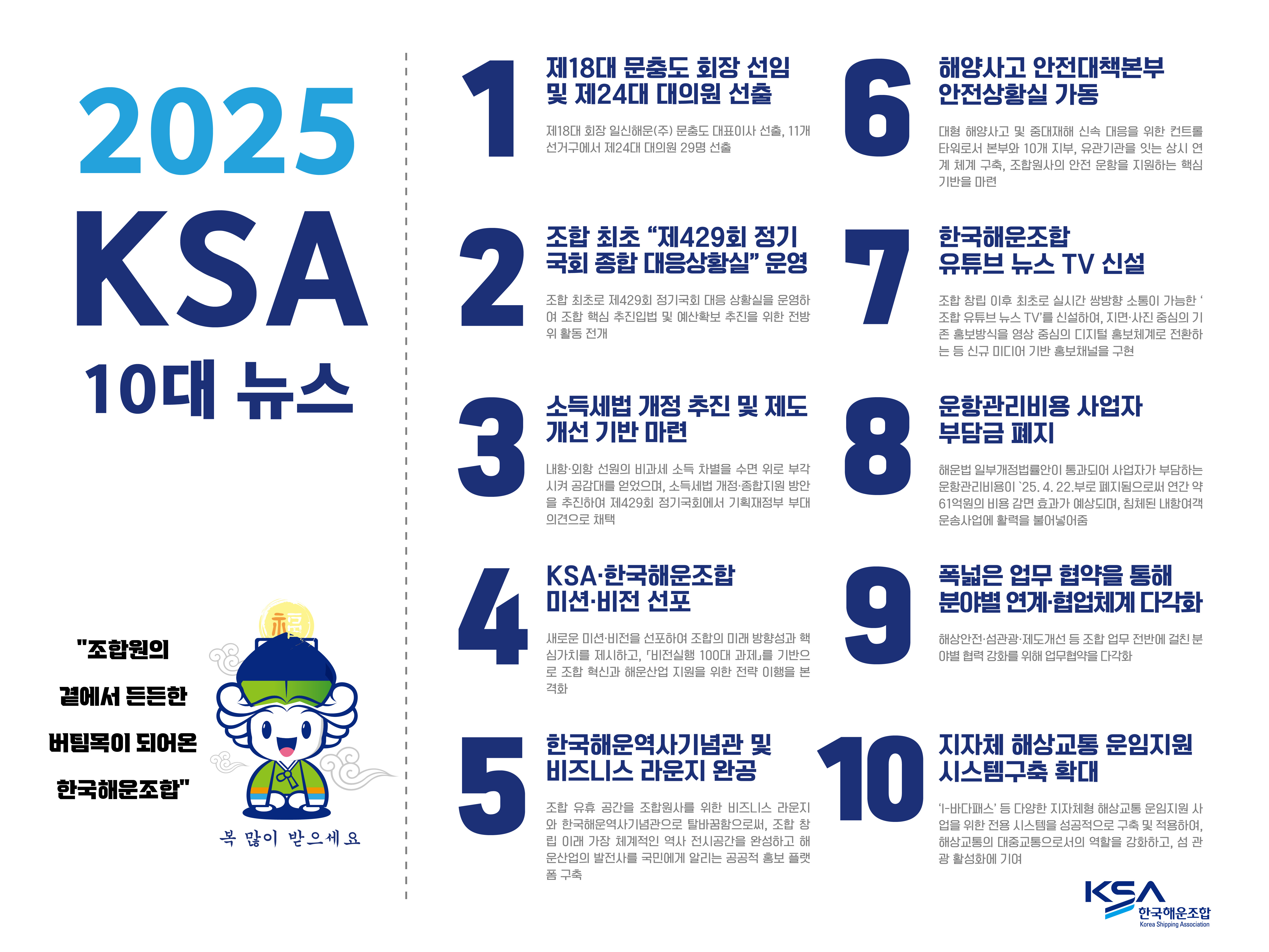 À̹ø ¡®2025 Çѱ¹ÇØ¿îÁ¶ÇÕ 10´ë ´º½º¡¯ ¼±Á¤Àº Á¶ÇÕÀÌ Á¶ÇÕ¿ø ¹× ÇØ¿î¾÷°è¿Í ÇÔ²² ÀÌ·ï³½ ±½Á÷ÇÑ ¹ßÀÚÃ븦 µÇµ¹¾Æº¸°í, ´Ù°¡¿À´Â »õÇØÀÇ µµ¾àÀ» ´ÙÁüÇÏ´Â °è±â°¡ µÇ¾ú´Ù.