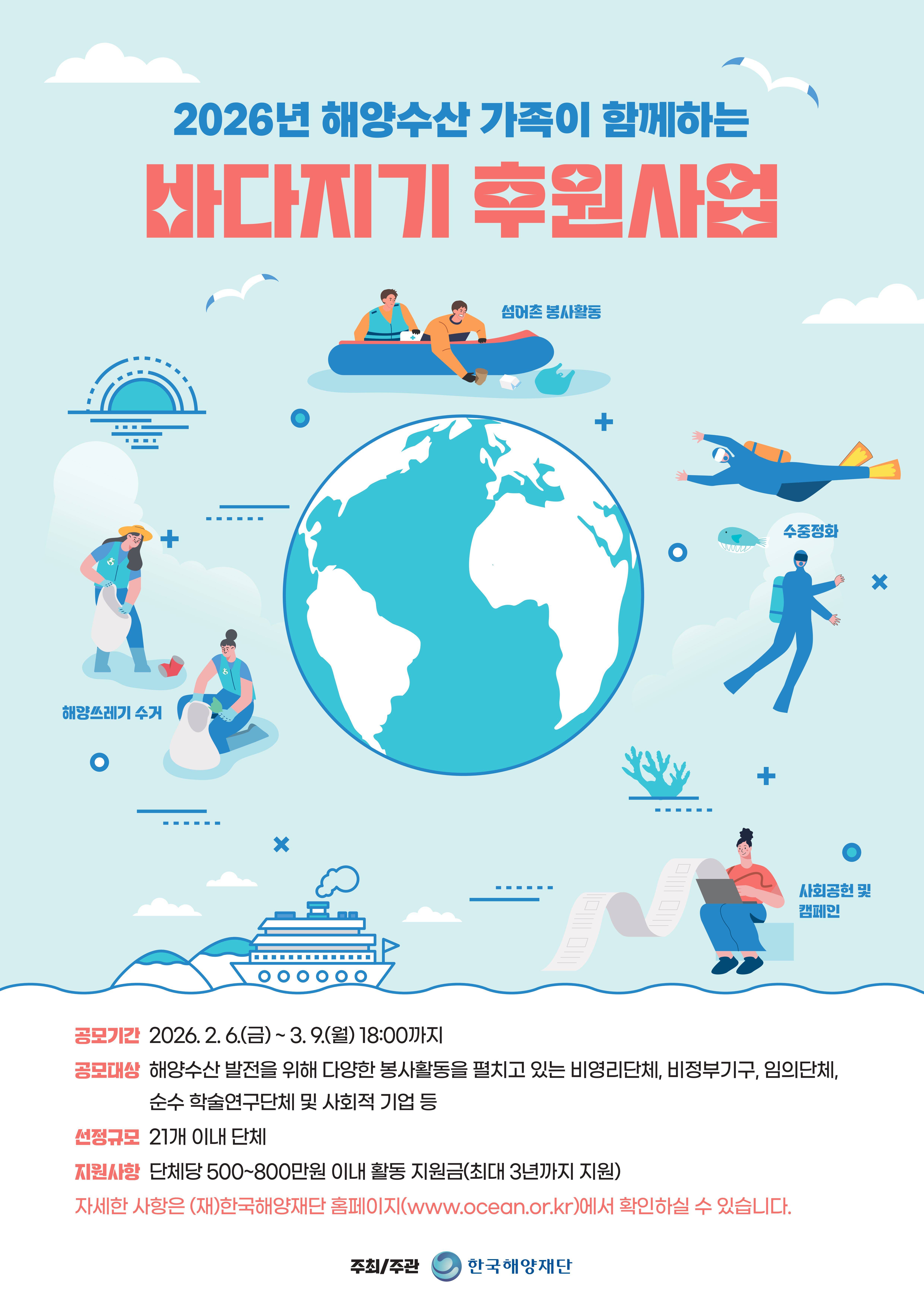 (Àç)Çѱ¹ÇؾçÀç´Ü(ÀÌ»çÀå ¹®Çس²)Àº ÇØ¾ç¼ö»ê ºÐ¾ß¿¡¼ Çå½ÅÀûÀ¸·Î ºÀ»çȰµ¿À» ÆîÄ¡´Â ºñ¿µ¸® ¹Î°£´Üü, NGO µîÀ» Áö¿øÇϱâ À§ÇÑ ¡®2026³â ÇØ¾ç¼ö»ê °¡Á·ÀÌ ÇÔ²²ÇÏ´Â ¹Ù´ÙÁö±â ÈÄ¿ø»ç¾÷(ÀÌÇÏ ¹Ù´ÙÁö±â ÈÄ¿ø»ç¾÷)¡¯À» ÃßÁøÇÑ´Ù°í ¹àÇû´Ù.