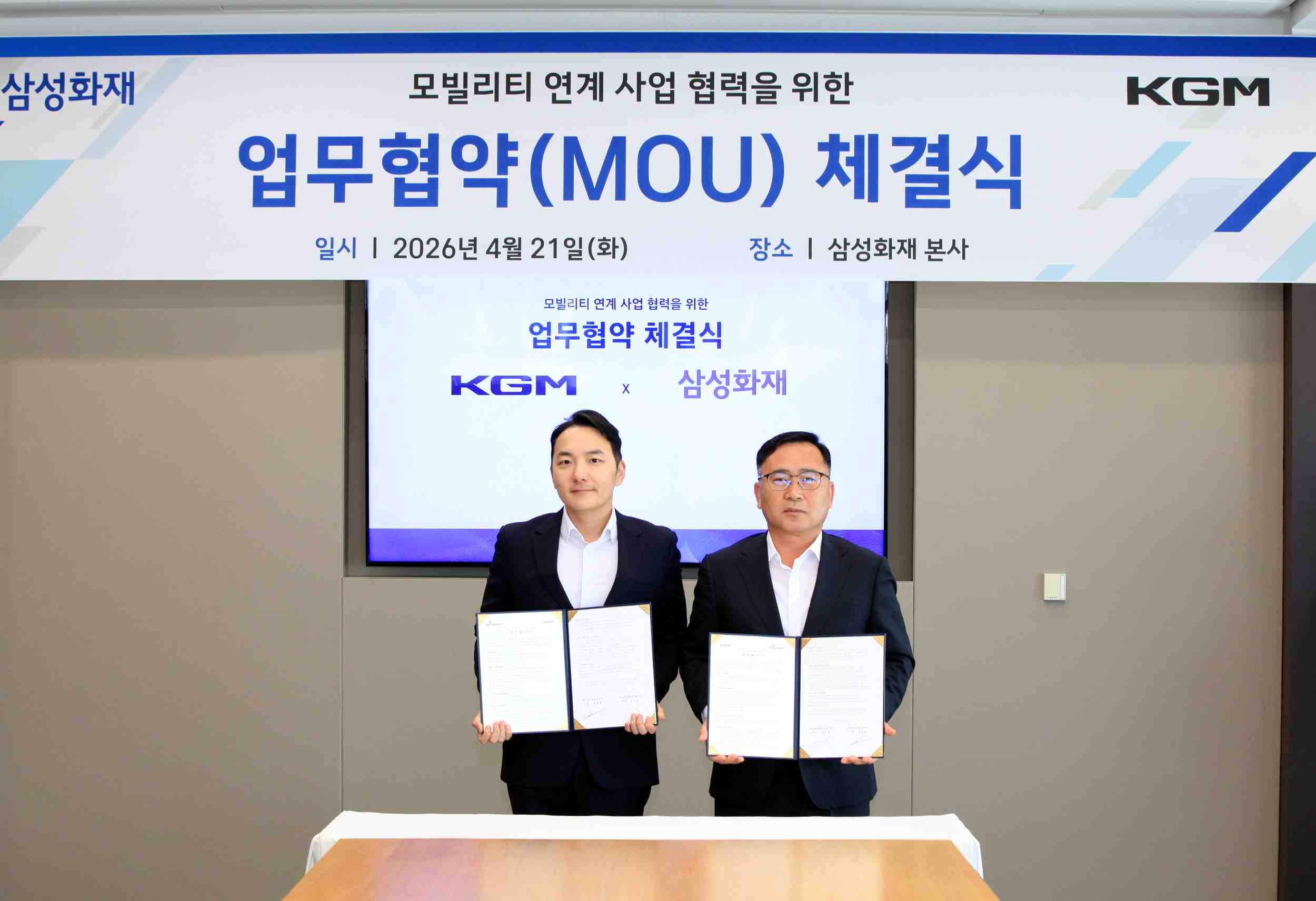 4¿ù 21ÀÏ ¼¿ï ¼Ãʱ¸ »ï¼ºÈÀç º»»ç¿¡¼ ÁøÇàµÈ Çù¾à½Ä¿¡´Â KGM »ç¾÷Àü·«ºÎ¹® °ûÁ¤Çö »çÀå, »óǰÀü·«½Ç Á¶º´Ã¶ »ó¹«¸¦ ºñ·ÔÇØ »ï¼ºÈÀç ÀÚµ¿Â÷º¸ÇèºÎ¹® ÀÌ»óµ¿ ºÎ»çÀå, ¸ðºô¸®Æ¼»ç¾÷ÆÀ ¿ÀÀϼ® »ó¹« µî ¾ç»ç ÁÖ¿ä °ü°èÀÚ°¡ Âü¼®Çß´Ù.